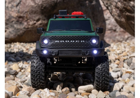 Scale realism is a defining trait of the Axial SCX24 green Ford Bronco with Nitto tyres and molded body details. The officially licensed Nitto Trail Grappler M/T tyres offer a blend of aggressive tread and soft compound grip, making them ideal for both off-road and indoor use. Meanwhile, working front lights and molded lenses on all four corners enhance visual authenticity and allow for nighttime crawling. These details make the Bronco not just a capable performer, but a visually compelling replica of its full-size counterpart.