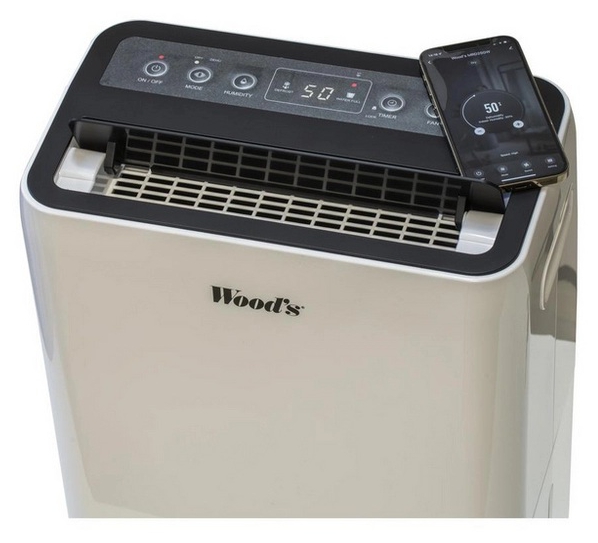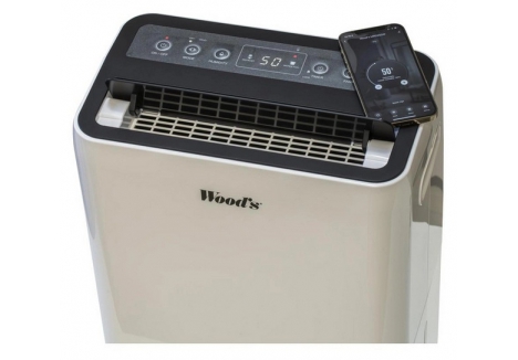 For a cleaner, drier home with smart control in White, buy Woods MRD20GWKIT Dehumidifier with Free Hygrometer White today and benefit from 20 L daily removal, Wi?Fi remote adjustments, a top exhaust for laundry drying, castor wheel portability, automatic shut?off safety, two fan speeds, and continuous drainage convenience.