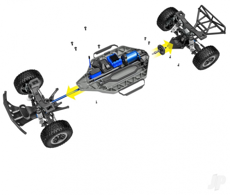 The Traxxas RC car with HD driveshafts and modular chassis uses a fiber-composite tub with integrated electronics and a long 324 mm wheelbase for stability. The Extreme Heavy Duty Upgrade Kit includes Maxx-duty driveshafts, 6 mm axles, steel wheel hexes, and reinforced shock towers. These upgrades ensure consistent power delivery and structural resilience under extreme conditions, making the Slash VXL ready for competitive terrain.