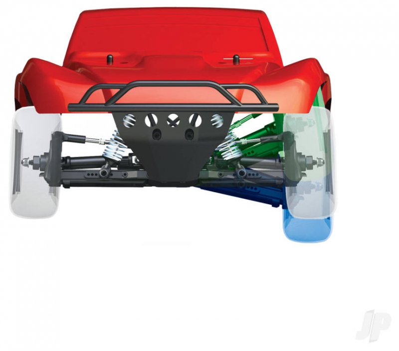 Traxxas Stability Management (TSM) integrated into the Traxxas TRX68386-4-RED brushless short course truck adjusts steering and throttle inputs to maintain control on low-traction surfaces. TSM allows drivers to execute throttle-on powerslides and maintain straight-line acceleration without dulling throttle response. The system is adjustable from the transmitter, offering up to 100% assistance or full manual control, ideal for short course racing conditions.