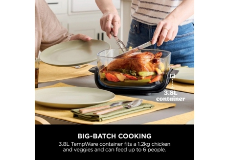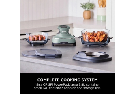 The dual-container system includes a 1.4L vessel for personal meals, snacks, or leftovers, and a 3.8L container for larger portions or family-style cooking. The PowerPod adaptor ensures a secure fit when using the larger container. This flexibility allows users to prepare meals efficiently, whether cooking for one or entertaining guests.