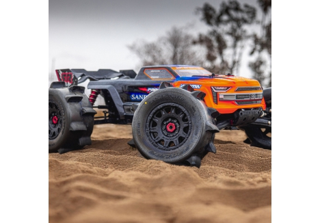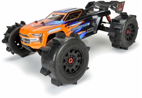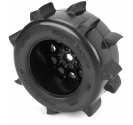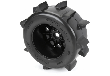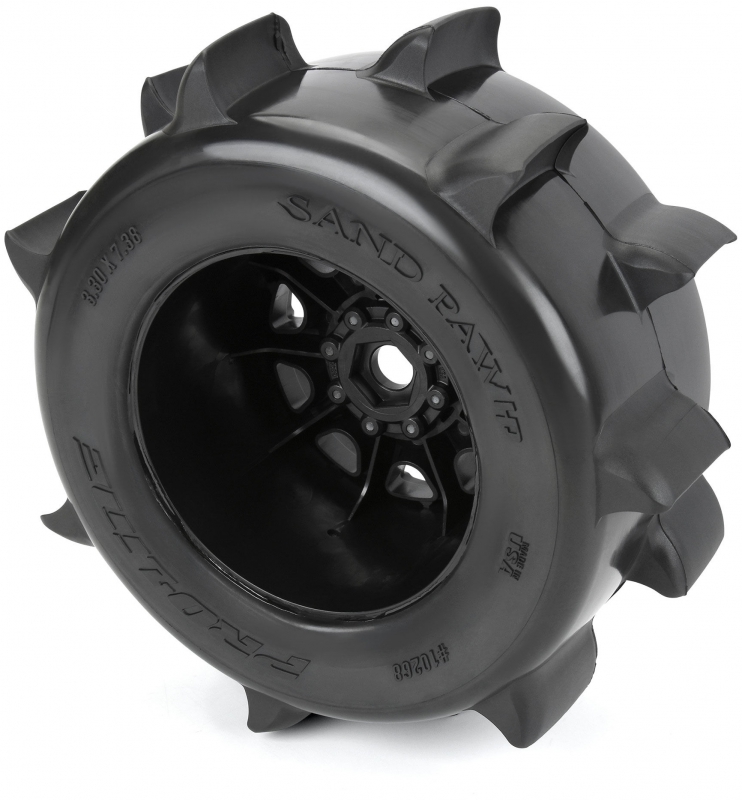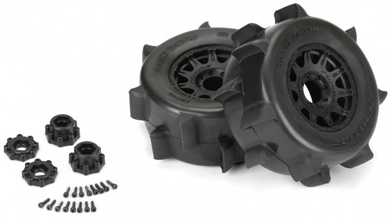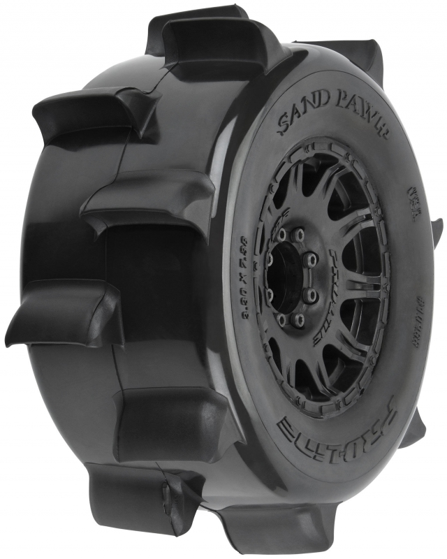 This is a pair of pre-mounted Sand Paw HP 3.8" Paddle tires. Sand Paw HP brings belted technology to the beloved split-paddle design. You can now grip it and rip it in the snow, at the beach or desert with virtually zero tire expansion, allowing you to lay down maximum power and throw huge roosts. The Sand Paw HP uses Pro-Line's High-Performance herringbone weave pattern Belt technology inside the tire, which features a beefy, reinforced split-paddle tread inspired by 1:1 Sand Drag rail tires. Just like all Pro-Line's tires, they are proudly Made in the USA.