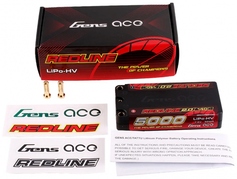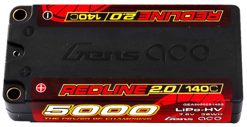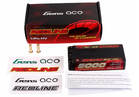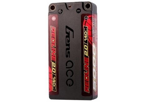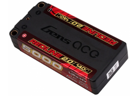 Gens ace Redline 2.0 Series 140C 5000mAh 2s Hardcase LiPo Battery Pack, with a factory installed 5.0mm bullet. Consumers trust the Gens ace name to deliver the dependability and high performance they expect. The Gens ace Redline LiPo battery pack has a high-capacity, high-discharge rate that gives you the power and run-time you expect.