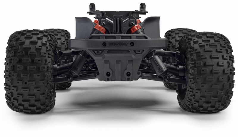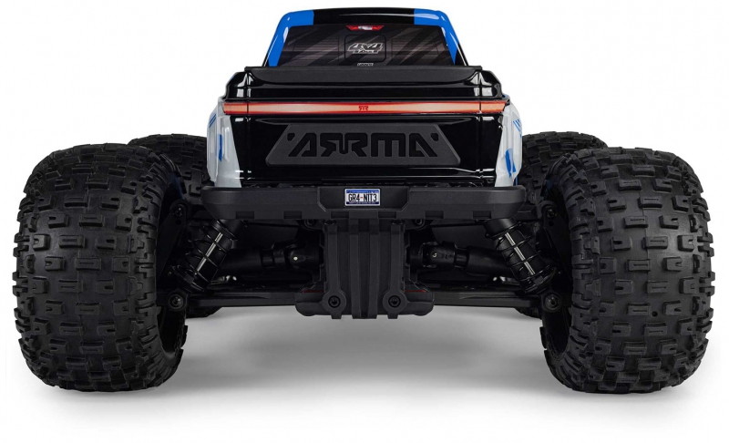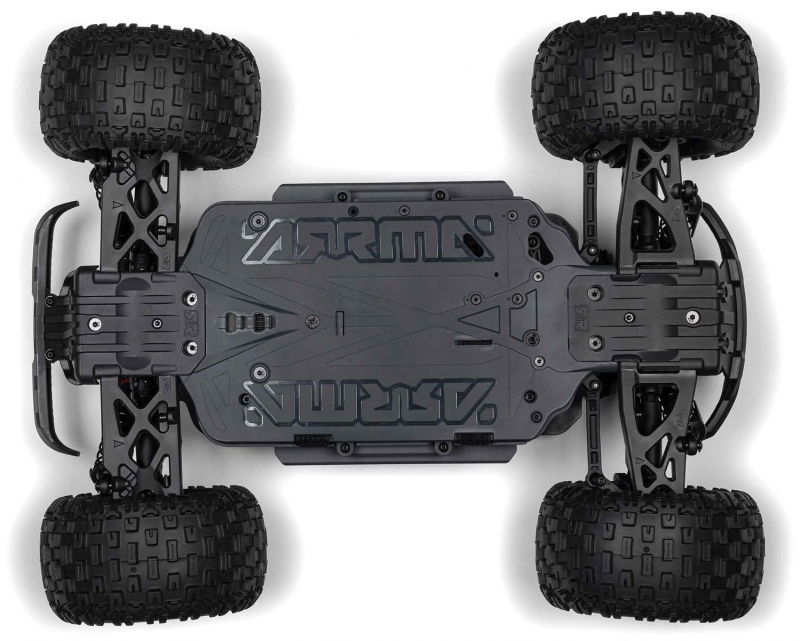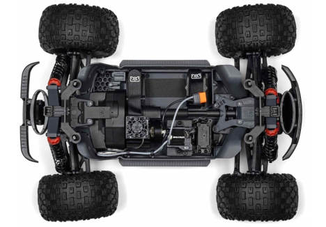 The ARRMA monster truck with foam-insert wheels and oil-filled coilover shocks is built to take hits and keep going. The oil-filled shocks smooth out rough terrain, while the foam-insert wheels absorb vibration and maintain traction. Impact-absorbing bumpers and a shock tower protector add structural resilience during aggressive driving. The driveshaft stone guard and adjustable battery straps further protect internal components and support varied battery sizes. These features combine to deliver a monster truck that’s not only tough but also refined in its handling and responsiveness.