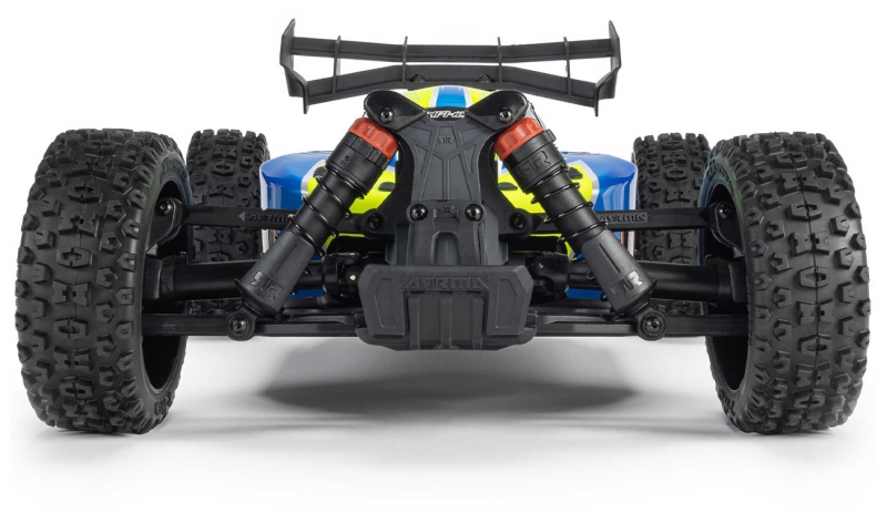 The ARRMA racing buggy with foam-insert wheels and oil-filled coilover shocks is built to take hits and keep going. The oil-filled shocks smooth out rough terrain, while the foam-insert wheels absorb vibration and maintain traction. Impact-absorbing bumpers and a shock tower protector add structural resilience during aggressive driving. The driveshaft stone guard and adjustable battery straps further protect internal components and support varied battery sizes. These features combine to deliver a racing buggy that’s not only tough but also refined in its handling and responsiveness.