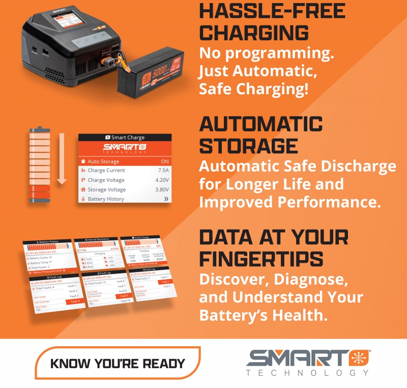 Spektrum Smart LiPo batteries also maintain an error log, including the number of overheating, over-discharging, and overcharging incidents, which can be helpful data in assuring that the battery you've chosen is correct for the application. A Smart Battery automatically uploads its charge parameters to a Spektrum Smart Charger, making charging simple. The charge rate of every Smart Battery is customizable, allowing you to take full advantage of packs with faster charge ratings.