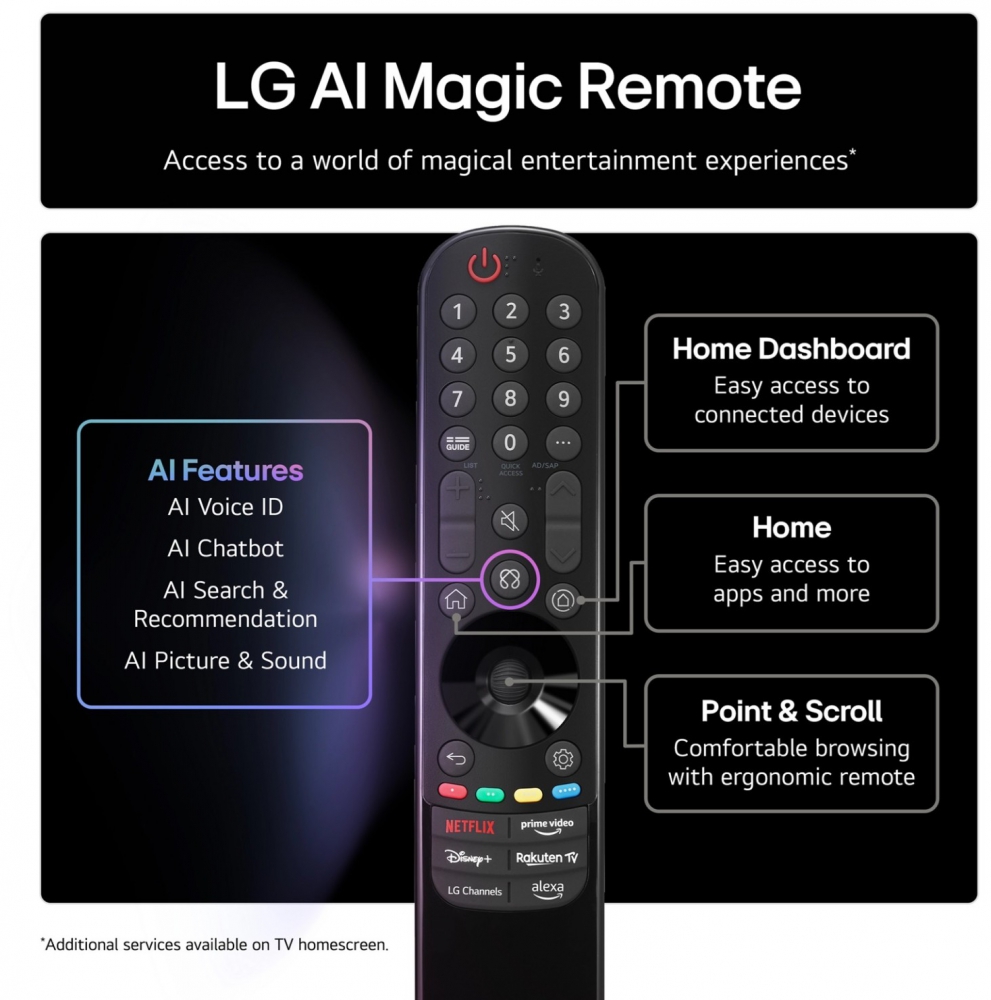 - AI Magic Remote: Offers motion control, scroll wheel navigation, and voice commands with drag-and-drop functions