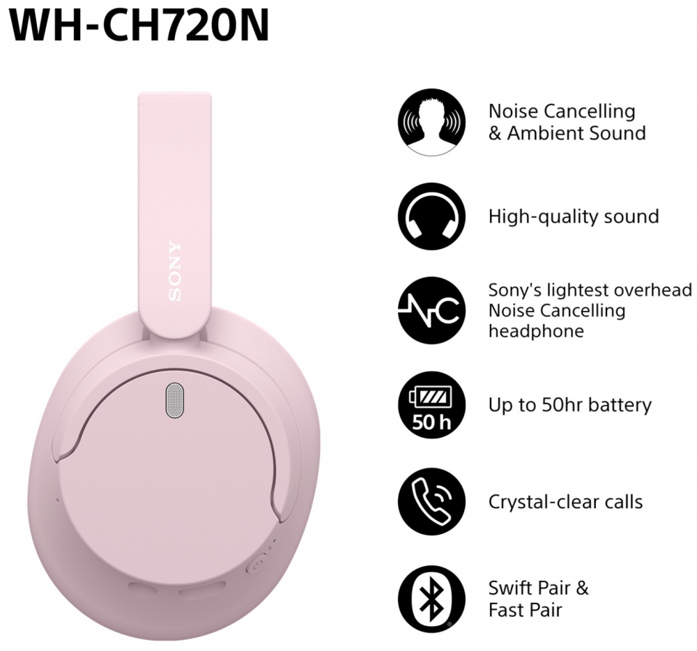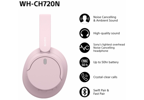 Buy Sony WHCH720NP noise cancelling headphones with 50hr battery life pink today and enjoy immersive sound with effortless style.