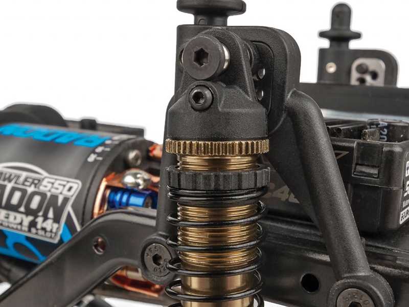 - Factory Team bronze shocks – ultra-smooth dampers with plastic bleeder caps and collars for consistent rebound