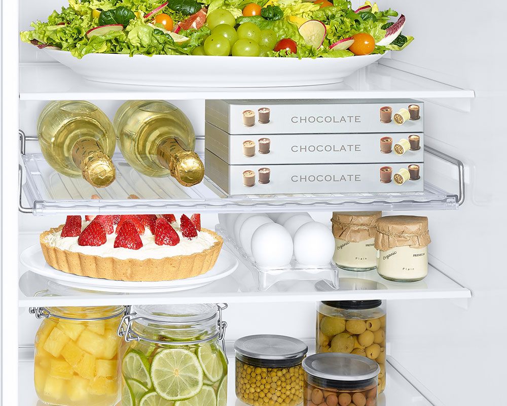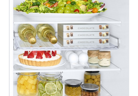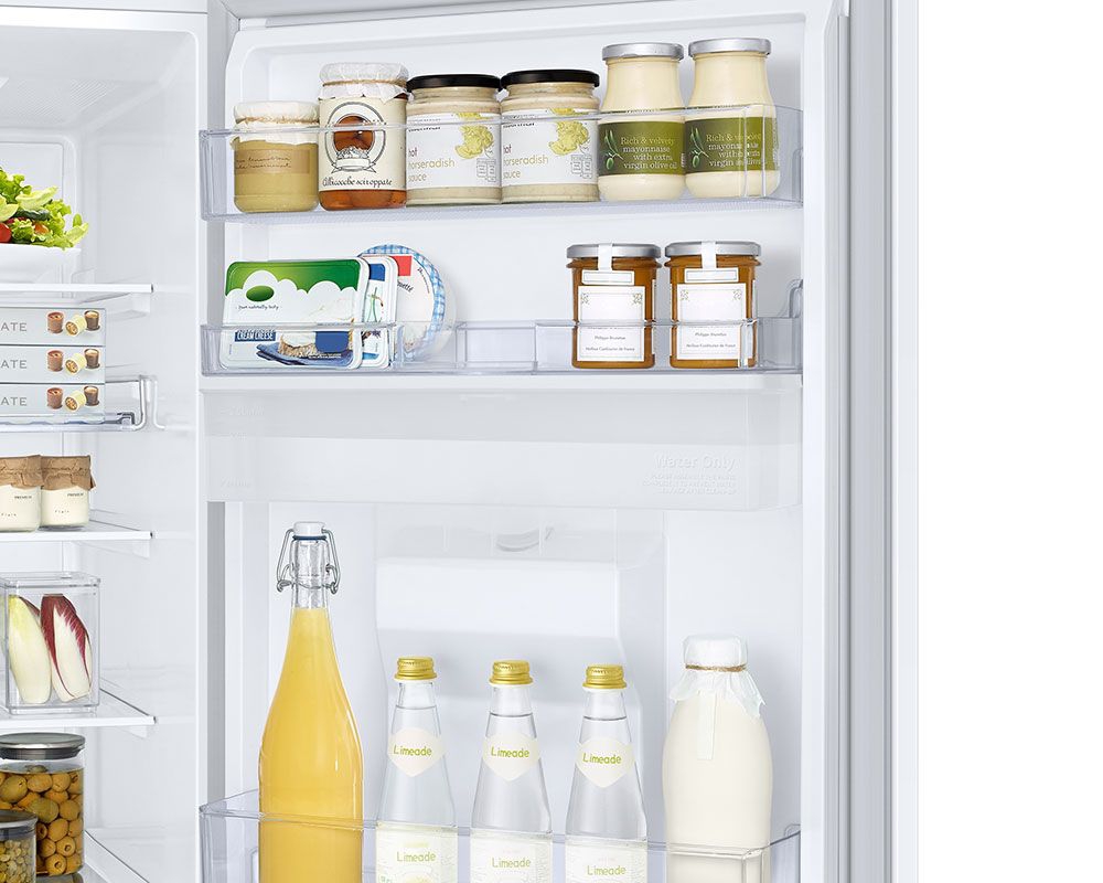 The Samsung RB34C632EWW Series 6 Fridge Freezer White offers a range of storage features tailored to diverse needs. The extra-wide wine rack is perfect for larger bottles or flat items like pizzas, providing flexibility beyond traditional shelving. The slim water tank is integrated into the door, freeing up shelf space and offering convenient access to chilled water. Its flat top doubles as a shelf for storing frequently used items such as butter, jams, or snacks. With three freezer drawers, three fridge shelves, and a dedicated vegetable drawer, this fridge freezer is built to accommodate everything from daily essentials to special occasion supplies.