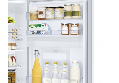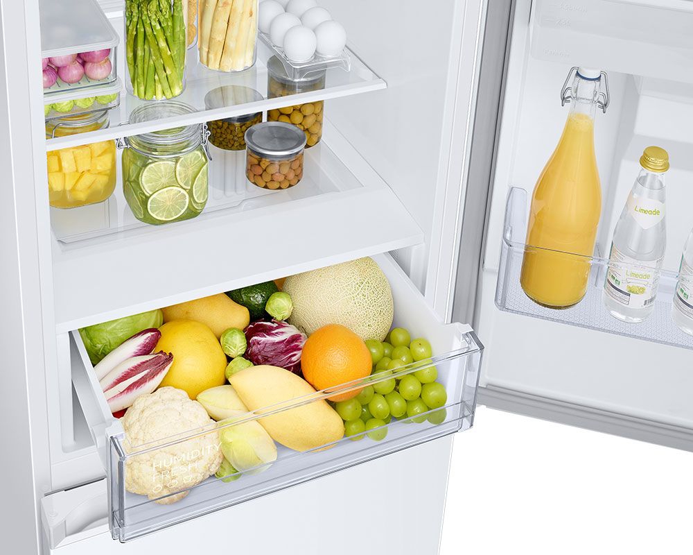 The Samsung RB34C632EWW Series 6 Fridge Freezer White is built with SpaceMax technology, which enhances internal capacity without altering the appliance’s external dimensions. This design innovation allows for a total gross volume of 341 litres, split between a 227-litre fridge and a 114-litre freezer. The fridge compartment includes three adjustable tempered glass shelves and a dedicated vegetable drawer, offering flexibility for storing fresh produce, dairy, and beverages. The Big Door Bin is wider and deeper than standard shelves, making it ideal for storing large bottles and cartons upright. This thoughtful layout ensures that users can organise their groceries efficiently while maintaining a clean and uncluttered kitchen.