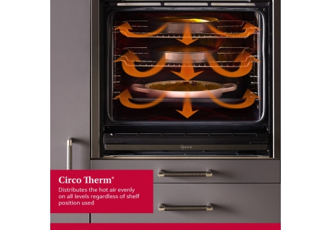 This multifunction electric oven with fan features seven cooking modes, including Full Width Grill, Hotair Gentle, Hot Air, Conventional Heat, Pizza Setting, Bottom Heat, and Hot Air Grilling. Neff’s CircoTherm® hot air system circulates heat evenly across three levels, allowing you to prepare multiple dishes simultaneously — ideal for entertaining or batch cooking. Whether roasting meats or baking delicate pastries, enjoy consistent, reliable results with every meal.