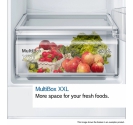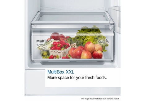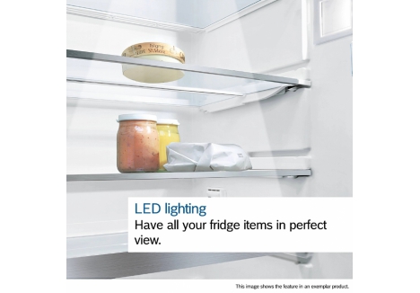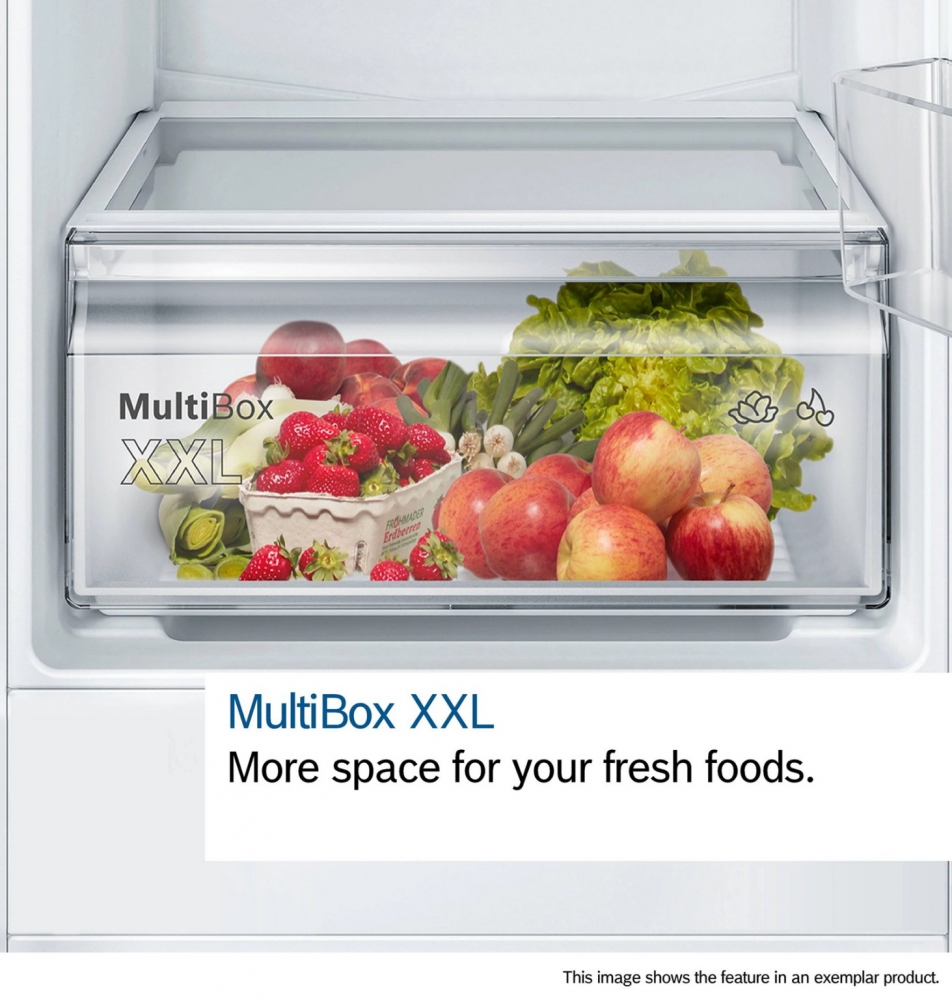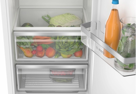 The Bosch KIR81VFE0G fridge includes six safety glass shelves (five adjustable), five door bins, a bottle support grid, and three egg trays. The MultiBox XXL drawer is perfect for bulky produce, while LED lighting ensures clear visibility throughout. With no freezer compartment, the full interior is dedicated to fresh food storage.