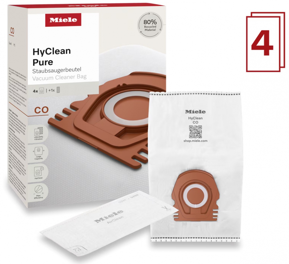 The Miele HyClean Pure CO vacuum cleaner bag HYCLEANPURECO is a high-performance filtration solution designed for Guard M1 models. Engineered to deliver maximum suction power and hygienic dust containment, this original Miele accessory combines patented airflow technology with eco-conscious materials. With 80% recycled content and a 50% longer service life than standard alternatives, the Miele HYCLEANPURECO vacuum bag with AirClean filter system offers exceptional value and reliability for everyday cleaning. Its ComfortFit design ensures a perfect fit, while the HyClose collar seals automatically for mess-free disposal.