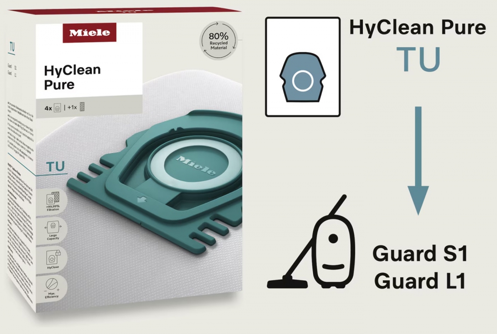 The Miele HyClean Pure HYCLEANPURETU vacuum cleaner bags are engineered to deliver maximum hygiene, long-lasting suction, and eco-conscious performance. Designed for Guard L1 and S1 models, these original Miele accessories feature patented airflow guides, multi-layer filtration, and a self-sealing HyClose collar for mess-free disposal. With 80% recycled material and a 50% longer service life than standard alternatives, the Miele HyClean Pure HYCLEANPURETU dust bags offer exceptional value and reliability for everyday cleaning.