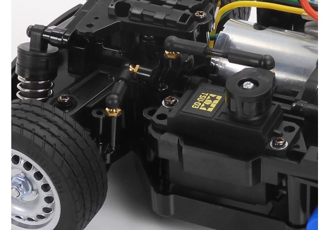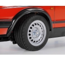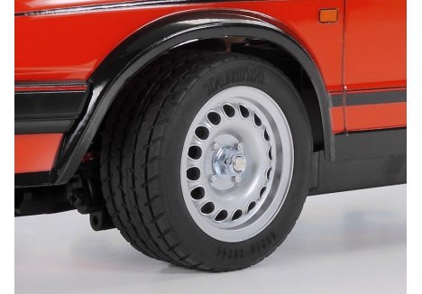 The Tamiya RC Golf GTI with double wishbone suspension delivers balanced handling and responsive steering. The symmetrical suspension design ensures consistent performance across both sides of the chassis, while the friction dampers absorb shocks effectively. Combined with the front-wheel drive layout, this setup provides a realistic driving experience that mirrors the behaviour of the original Golf II GTI 16V. The treaded 60D radial tyres and dish wheels further enhance grip and visual authenticity.