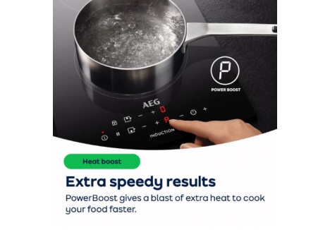 Induction technology heats the pan directly, ensuring fast and efficient cooking. The AEG TN64IA04FB induction hob responds instantly to temperature adjustments, allowing you to bring water to the boil in under 90 seconds using the PowerBoost function. Enjoy seamless and precise heat control with the energy efficiency that induction cooking provides.