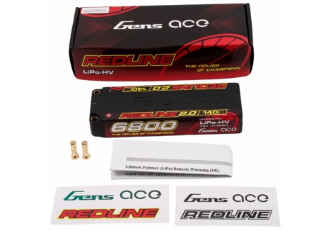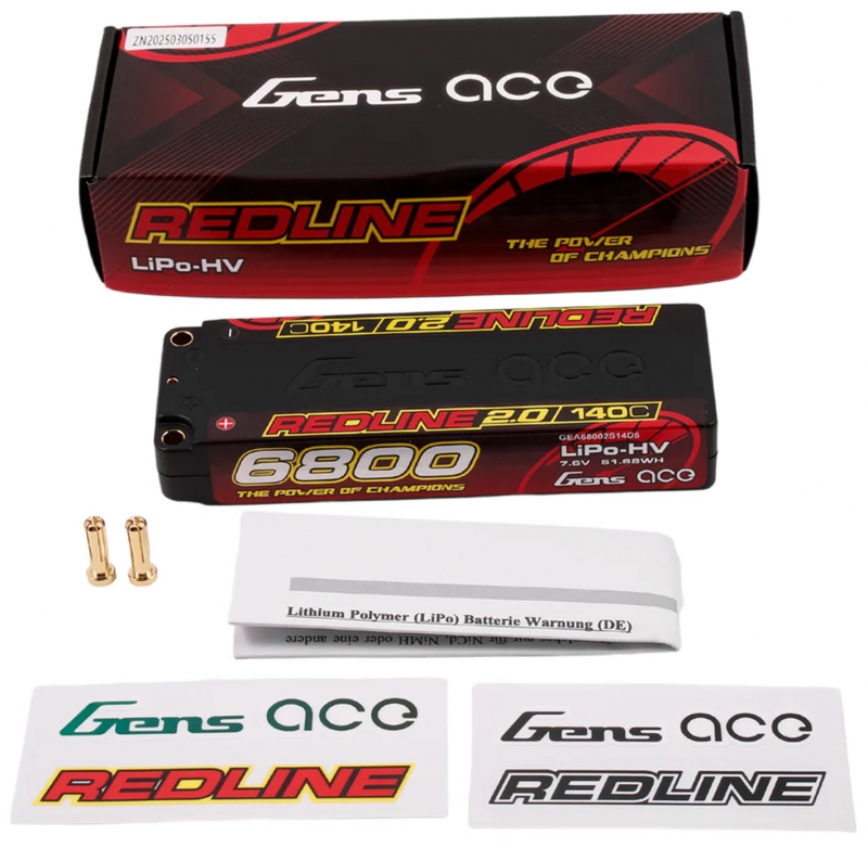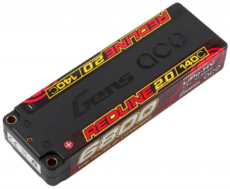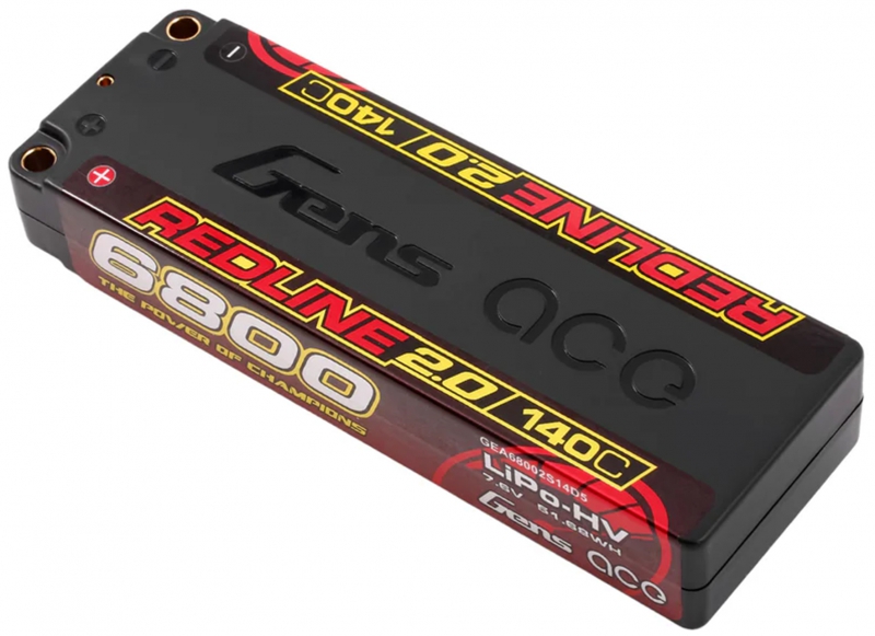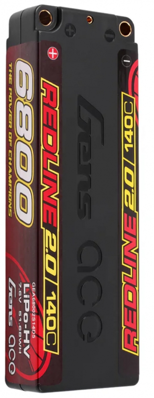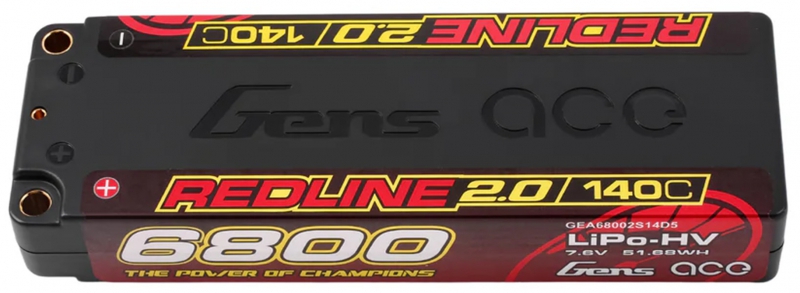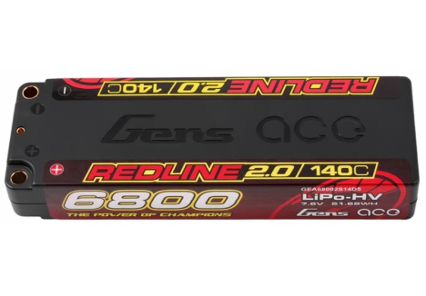 Gens Ace Redline 2.0 Series 2S 140C 6800mAh Hardcase LiPo Battery Pack; with a factory installed 5.0mm bullet. Consumers trust the Gens Ace name to deliver the dependability and high performance they expect. The Gens Ace 140C 2S 6800mAh 7.6V HV LiPo battery pack has a high-capacity; high-discharge rate that gives you the power and run-time you expect .