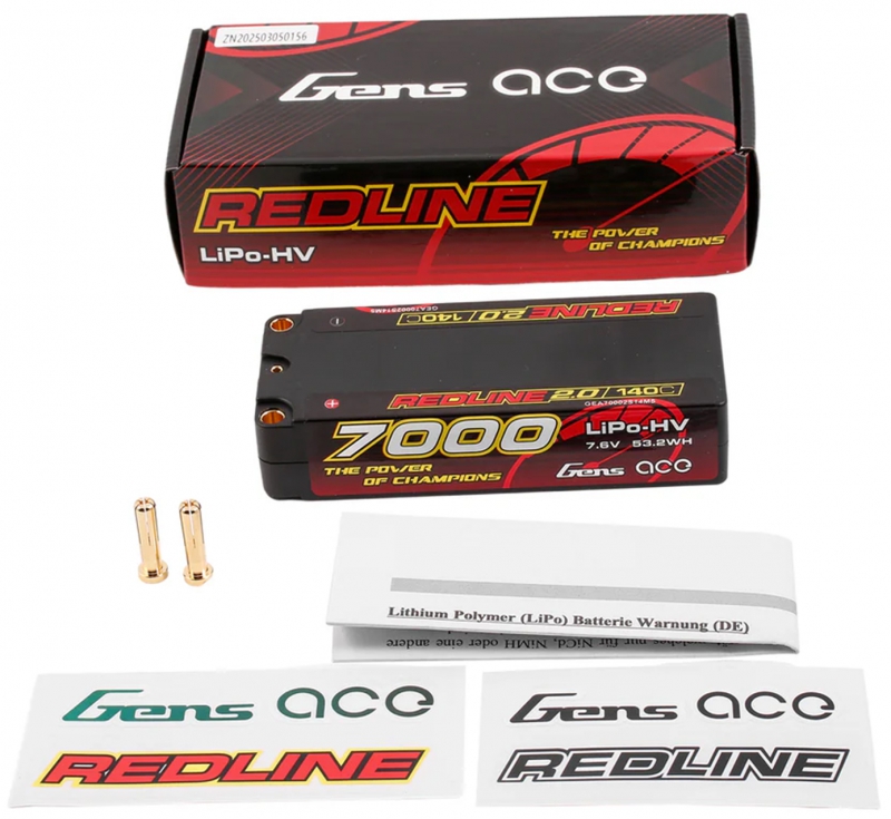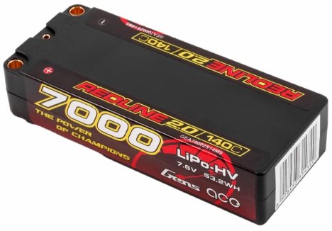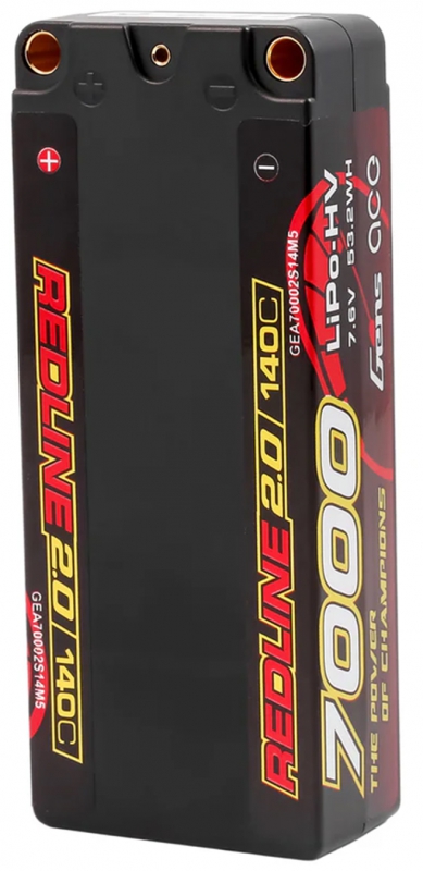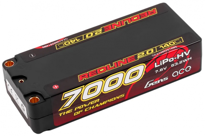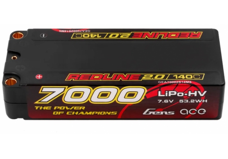Gens Ace Redline 2.0 Series 2S 140C 7000mAh Hardcase LiPo Battery Pack; with a factory installed 5.0mm bullet. Consumers trust the Gens Ace name to deliver the dependability and high performance they expect. The Gens Ace 140C 2S 7000mAh 7.6V HV LiPo battery pack has a high-capacity; high-discharge rate that gives you the power and run-time you expect .