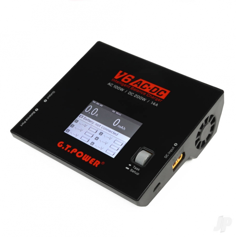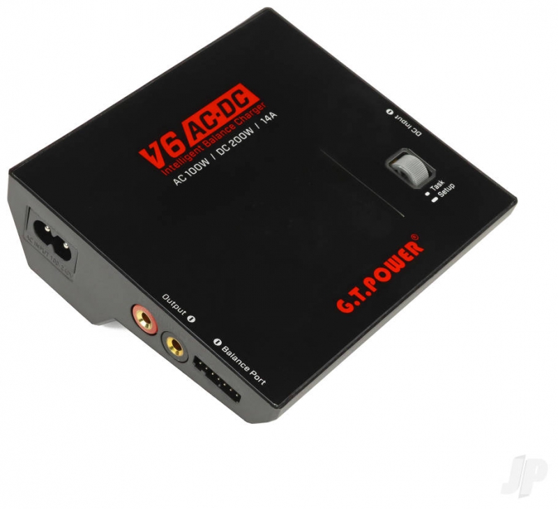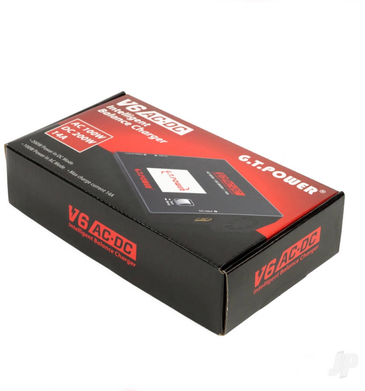 - Small, light and eminently travel-friendly this powerful little palm-size AC / DC home and field charger will comfortably replenish 1 to 6S LiPo, LiHV, LiIon and LiFe packs along with 1 to 16 cell NiMH and NiCd packs, plus 2 to 24V Pb batteries. That really is punching well above its weight, in fact G.T. Power s V6 Intelligent Charger will do it using a charge power of up to 200W and a charge current of between 0.1 and a whopping 14A. That's truly impressive versatility, offering the prospect of charging 6S EDF batteries, al fresco, in no time at all. It's a convenience that could even save you the cost of a third battery! Featuring a 2.4 inch, high definition, colour screen and an input power (10 24V) that allows a raft of LiPos to be employed, this is a charger that s destined to make your life easier both at home and in the field. We love it.