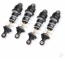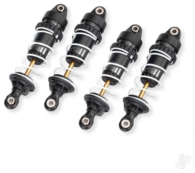 Give your Mini Maxx the ultimate suspension upgrade with aluminium GTR shocks. The brilliantly-anodised aluminium shock bodies are coated with PTFE for the slickest damping action available. Their large bores hold more oil than standard shocks for conistent dampening over the roughest terrain. Slick titanium-nitride coated shafts resist scuffing, increase durability, and eliminate "stiction." X-rings keep oil in and dirt out for smooth suspension action. Spring preload and ride height changes are as simple as turning the threaded spring collars. The lower spring retainers even feature a locking screw to prevent annoying pop-off in the middle of your run. Shocks come assembled with springs and silicone oil is included in the package. Sold as a complete set of four.