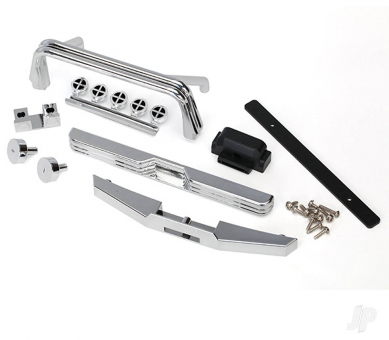 Replacement BIGFOOT No. 1 chrome body accessories include winch, bumpers (F&R), roll bar, light bar, engine detail, and mounting hardware.