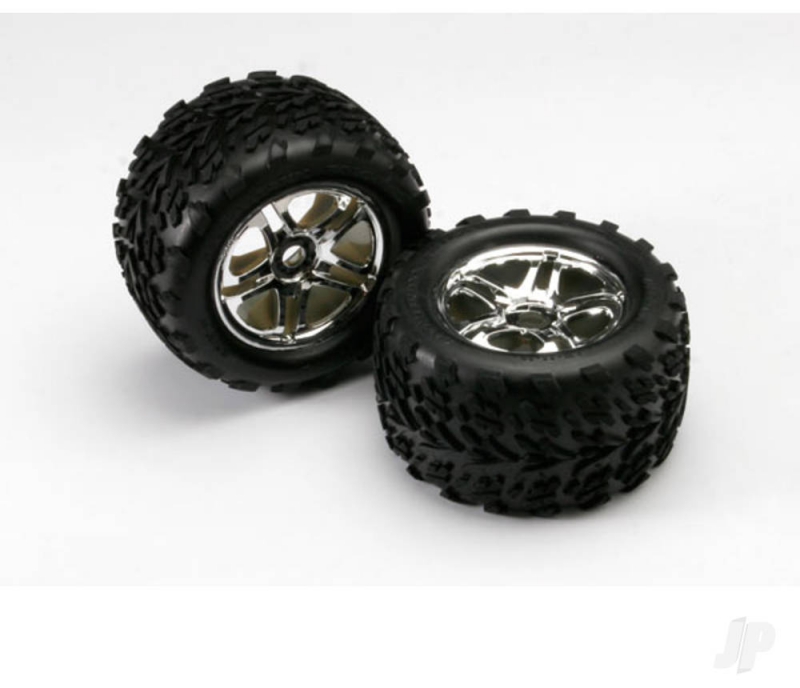 The Talon's unique tread pattern pattern and soft compound rubber delivers excellent grip on a variety of surfaces from pavement to off-road. The outside diameter is the same as a stock Maxx tyre but the larger 3.8in wheel diameter provides responsive handling with the low profile sidewall. Match foam inserts are included. Available as assembled and pre-glued with installed foam inserts on Gemini and Split-Spoke rims in a variety of finishes.