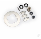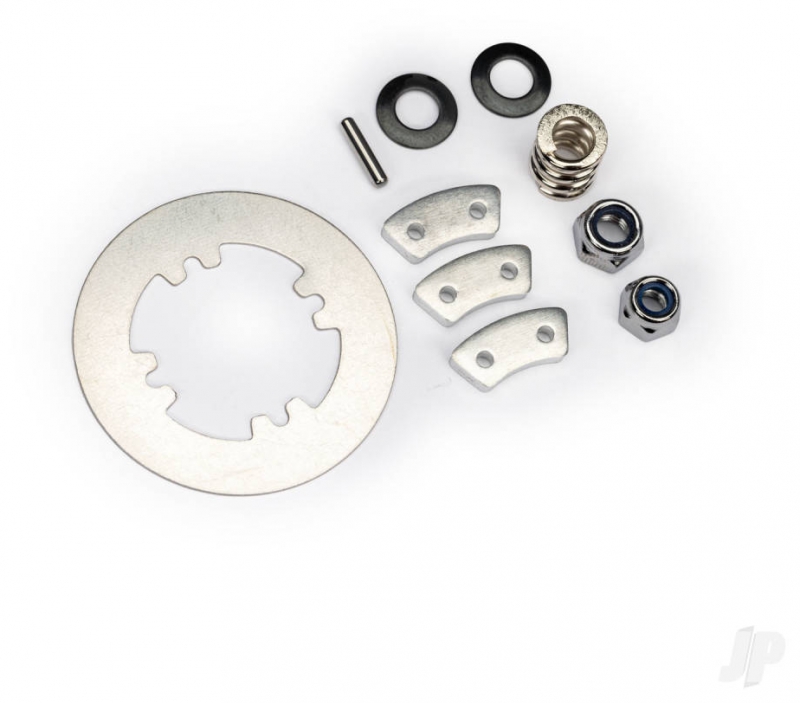 The heavy-duty clutch rebuild kit refreshes the heavy-duty slipper clutch with new steel disc, aluminium friction pads (3), spring, pin, 5x8 washer, 4 mm locking nut, and 5 mm locking nut. The aluminium friction pads offer greater heat resistance and can be used in place of the composite pads found in the standard-duty clutch.