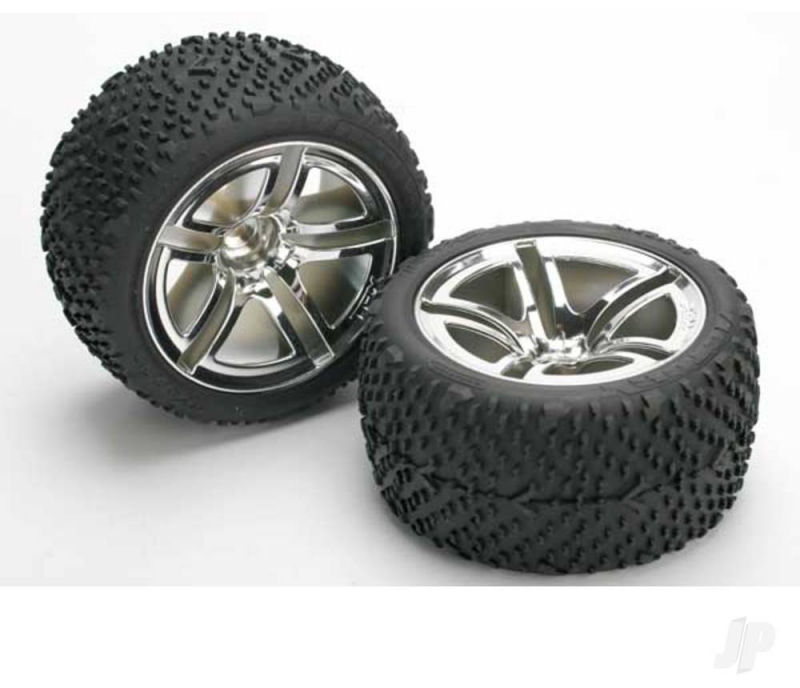 Twin-Spoke wheels redefine looks and convention by combining structural strength and futuristic stylings. The state-of-the-art design features a brilliant mirror-chrome face and a natural nylon bead for fast, easy tyre gluing. The horizontal bead helps grab the tyre, reducing the stress placed on the glue joint by tyre expansion.Victory Tyres are mounted and pre-glued on the chrome wheels for no-hassle, out-of-the-box bolt-on traction. moulded-foam inserts coupled with the directional tread design provide a balanced feel for the ultimate high-speed on-road experience. Victory Tyres and Twin-Spoke wheels also sold separately.