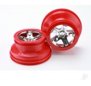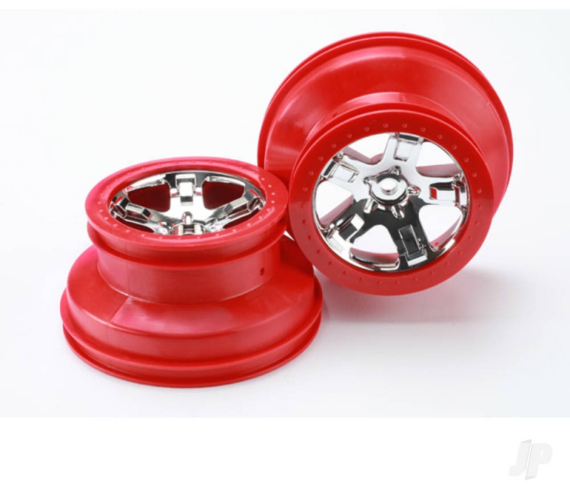 Pair of 5-spoke chrome SCT wheels with red beadlock-style trim feature a dual-profile design with a 2.2" outer diameter and 3.0" inner diameter.