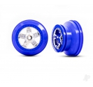 Pair of 5-spoke chrome SCT wheels with blue beadlock-style trim feature a dual-profile design with a 2.2" outer diameter and 3.0" inner diameter.