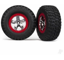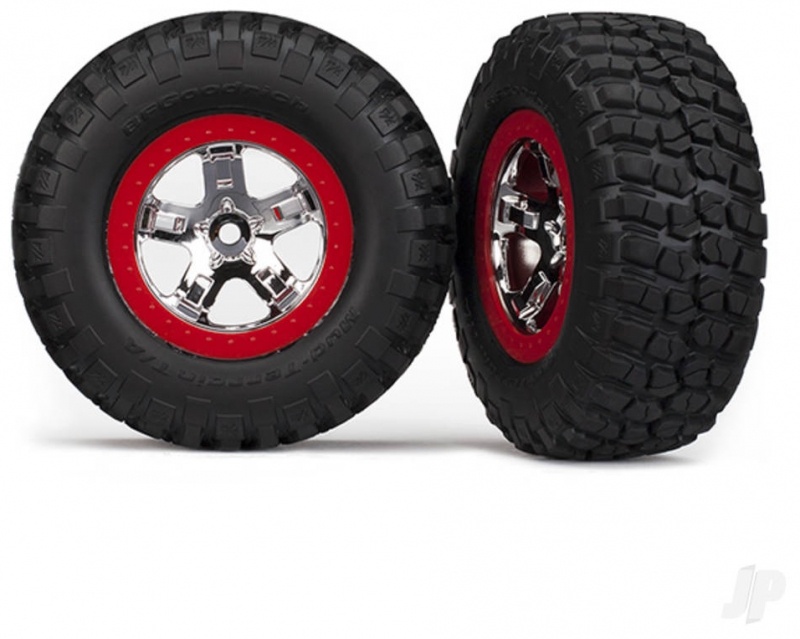 Pair of BFGoodrich Mud-Terrain T/A KM2 tyres come pre-glued and mounted with foam inserts to chrome SCT wheels with red beadlock-style trim.
