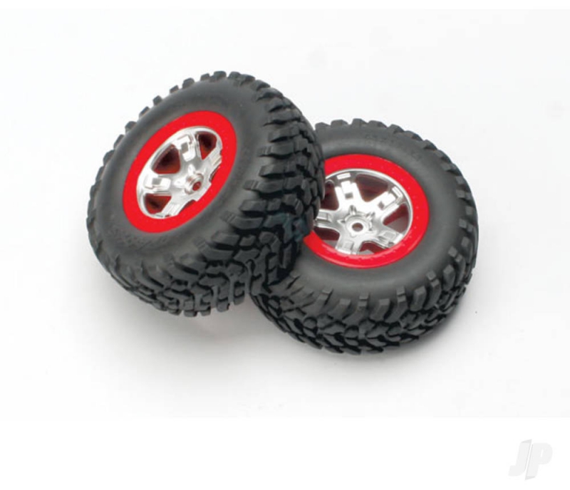 Red & Black Beadlock Satin Chrome Wheels For Slash & Slayer: Add instant inbeadlockin style to your Slash and Slayer with Traxxas' latest option wheels. The beadlock trim is moulded in colour for good looks that last, while the satin-chrome centre section provides the perfect contrast. To preserve the authentic stance and handling of Traxxas' popular short-course trucks, the wheels are offered in Slash- and Slayer-specific versions.