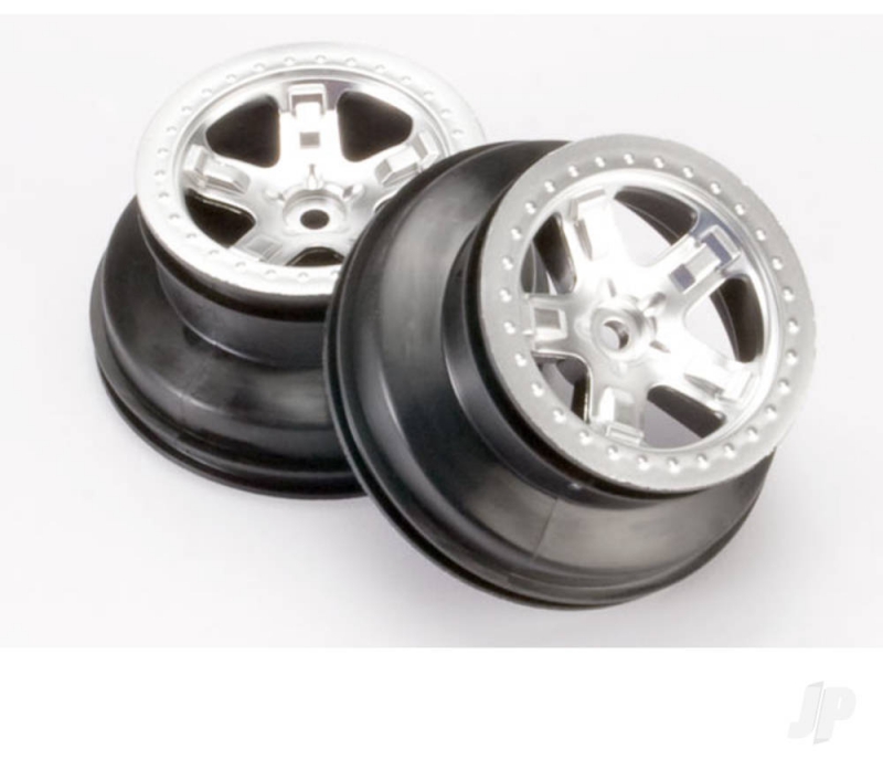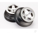 Pair of 5-spoke satin chrome SCT wheels with beadlock-style trim feature a dual-profile design with a 2.2" outer diameter and 3.0" inner diameter.