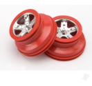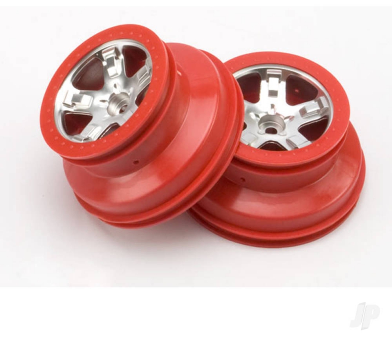 Pair of 5-spoke satin chrome SCT wheels with red beadlock-style trim feature a dual-profile design with a 2.2" outer diameter and 3.0" inner diameter.