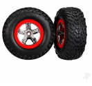 Pair of SCT off-road tyres come pre-glued and mounted with foam inserts to chrome SCT wheels with red beadlock-style trim.