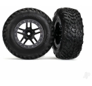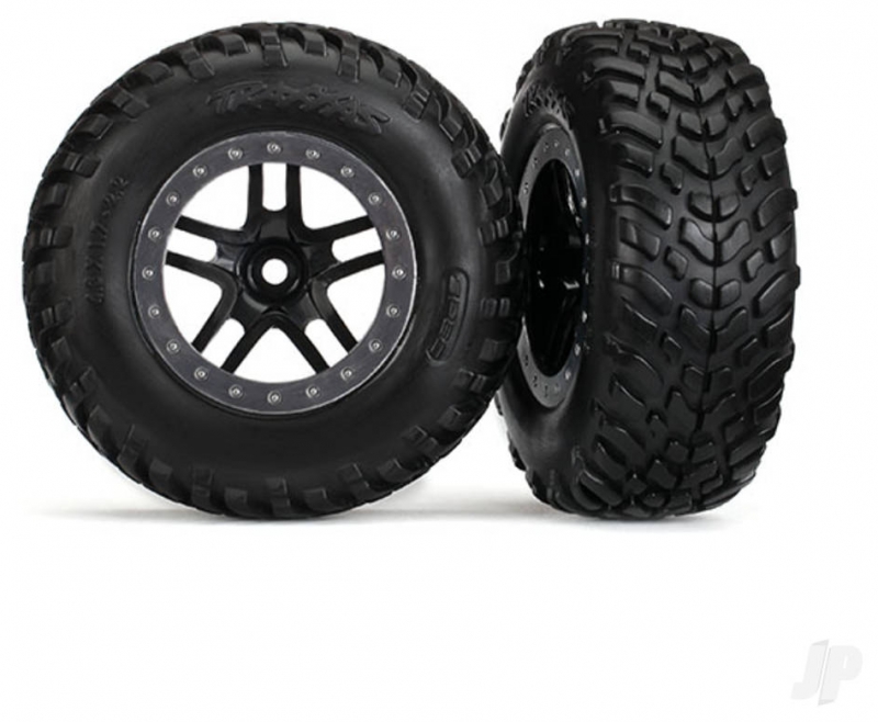 Pair of SCT off-road tyres come pre-glued and mounted with foam inserts to black Split-Spoke SCT wheels with satin chrome beadlock-style trim.