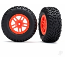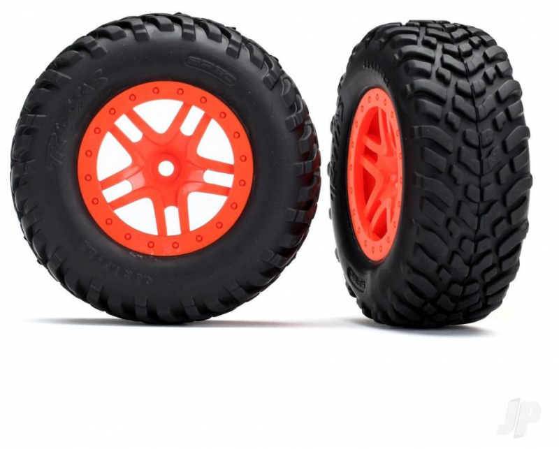 Pair of SCT off-road tyres come pre-glued and mounted with foam inserts to orange Split-Spoke SCT wheels with beadlock-style trim. TSM-rated for high-speed applications.