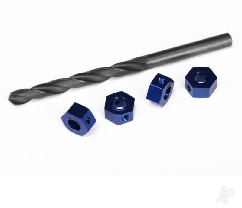 Traxxas now makes it possible to add the strongest, most durable front and rear driveshafts to the Rally, Slash 4X4, and Stampede 4X4. Originally designed for the 100+mph XO-1 Supercar, steel-splined driveshafts with 6mm axles can now be added to your favorite 4WD off-road model. The new Traxxas 12mm aluminium hex adapters feature a 6mm inner diameter to accept the beefier axles. The 12mm hex adapters are easy to install, compatible with Traxxas short course and rally wheels, and will also fit most standard 12mm hex-style wheels. The rugged machined-aluminium construction provides maximum performance, with custom looks coming from the vivid blue-anodised finish. Hex adapters require the following items for installation on Slash 4X4, Rally, and Stampede 4X4 -- #6451 (x2), #6452 (x2), #6439, #6455, #5117 (x3).