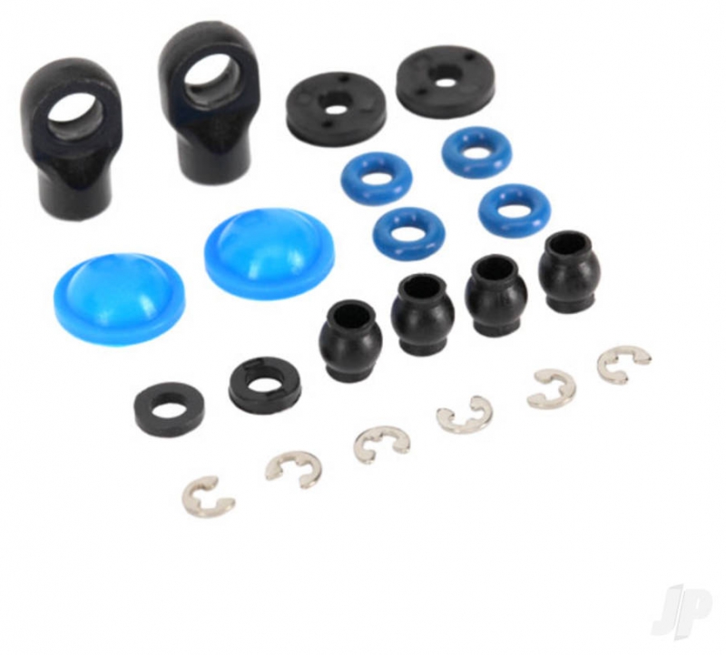 The GTR shock rebuild kit includes the parts needed to refresh two 1:16-scale GTR Shocks. The package includes silicone X-rings, bladders, bump stops, pistons, and hardware.