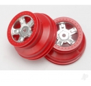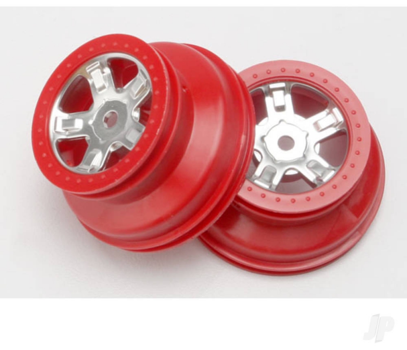 Pair of 1:16 scale 5-spoke satin-chrome SCT wheels with red beadlock-style trim feature a dual-profile design with a 1.8" inner diameter and 1.4" outer diameter.