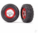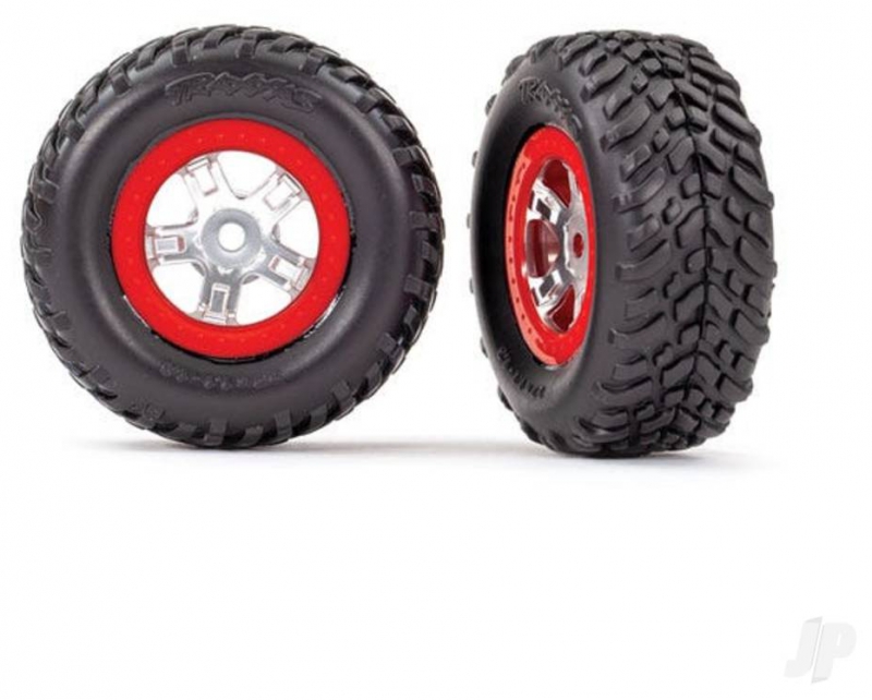 Pair of 1:16 scale SCT off-road tyres come pre-glued and mounted with foam inserts to satin-chrome SCT wheels with red beadlock-style trim. Includes one left and one right.