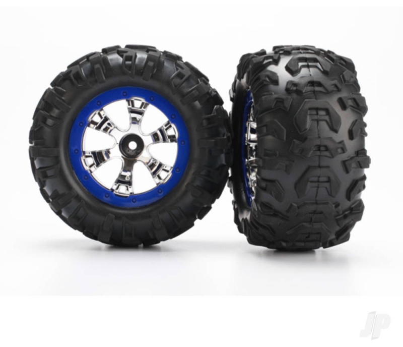 Dirt, mud, snowno matter where you run your 1:16 Summit, you can count on it to dig in hard with its aggressive Canyon AT tyres. The multi-terrain tread features large, angular lugs that put horsepower to the ground for powerful acceleration and all-terrain traction. The tough 2.2" chrome Geode wheels feature a blue beadlock-style sidewall protector. tyres come pre-glued and ready to mount with matching foam inserts. Includes one left and one right.