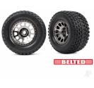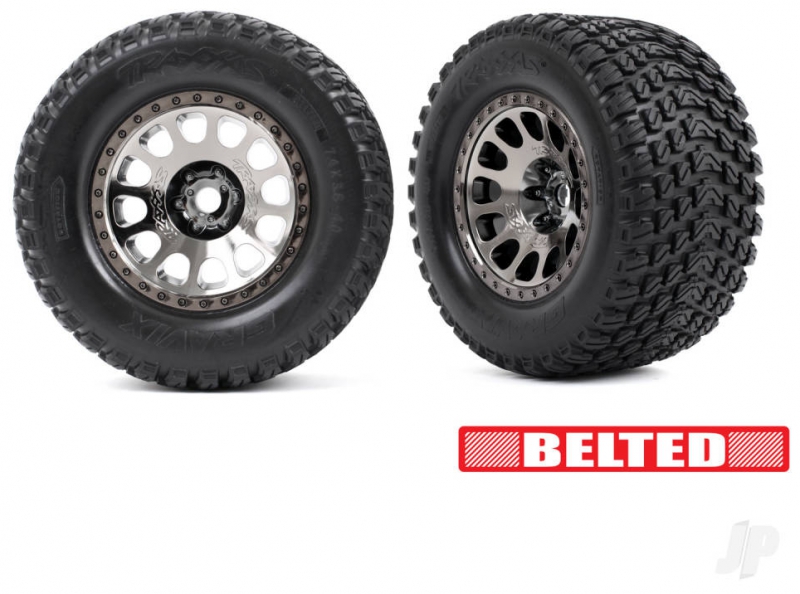 Belted Gravix low-profile 7.4" x 4.0" tyres deliver game-changing performance on the track or in the wild. The directional tread pattern provides excellent traction and runs quieter than typical off-road tyres. Lightweight belting in the carcass maintains the tyre's shape for a larger contact patch, more grip, and responsive handling at any speed.. Gravix tyres come pre-mounted to black chrome XRT wheels with an ultra-tough 8s-rated glue bead for the most extreme high-speed action. Sold as a left and right pair.