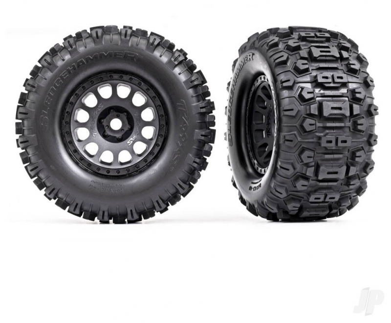 Ultra-rugged Sledgehammer tyres provides extreme traction and control for a variety of off-road terrain. At 8.4" tall, the Sledgehammers increased diameter gives your X-Truck a more powerful stance with even higher ground clearance. The tyres' open block tread design clears mud and debris for unmatched traction in loose surfaces. Sledgehammer tyres come pre-mounted to massive matte black XRT wheels with an ultra-tough 8s-rated glue bead for the most extreme high-speed off-road action. Sold as a left and right pair.