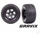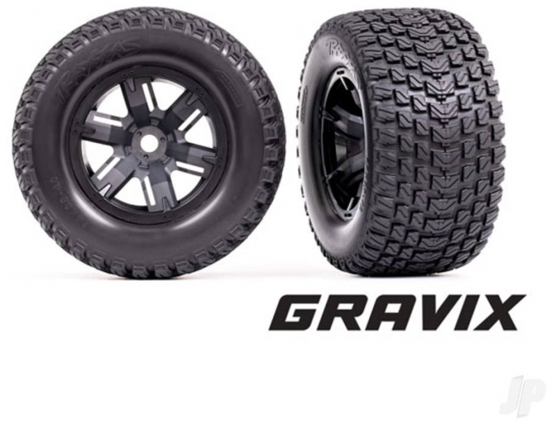 Low-profile 7.4" x 4.0" Gravix race tyres are built to run hard at the track or in the wild. The directional tread pattern runs quieter than traditional off-road tyres with excellent traction and a thick centre carcass to prevent ballooning at high speed. The tyres come pre-assembled and glued to matte black X-Maxx wheels with foam inserts. Sold as a left and right pair. Fits 24 mm splined hex, front or rear.