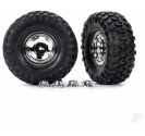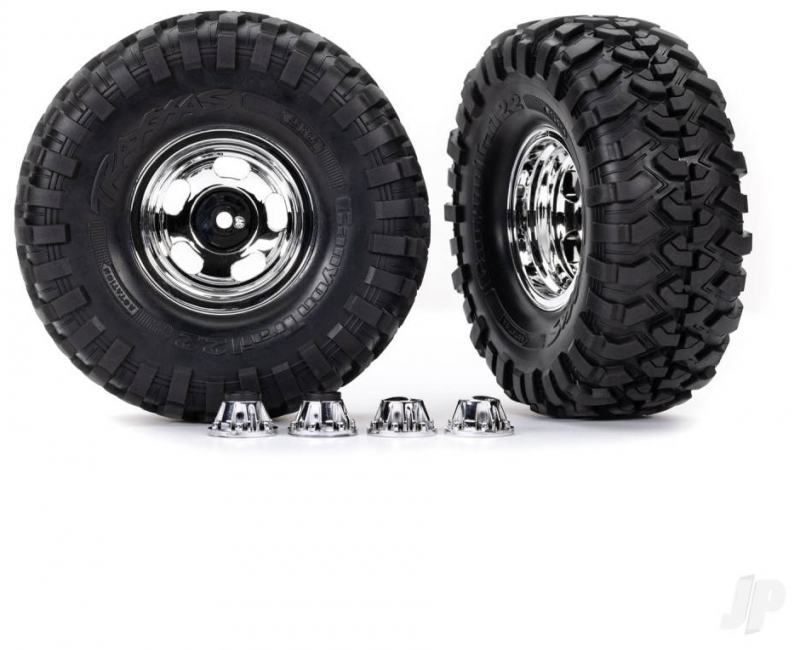 2.2" chrome slotted mag wheels come assembled and ready to mount with pre-installed foam inserts and mounted Canyon Trail 2.2" x 5.3" tyres. Canyon Trail tyres feature deep tread blocks for maximum traction on rough terrain with trail-tuned foam inserts for realistic climbing action. Includes centre caps (4). Although designed specifically for the Ford F-150 High Trail Edition, the wheel and tyre set fits all Traxxas TRX-4 models with a Long Arm Lift Kit installed. Includes one left and one right.