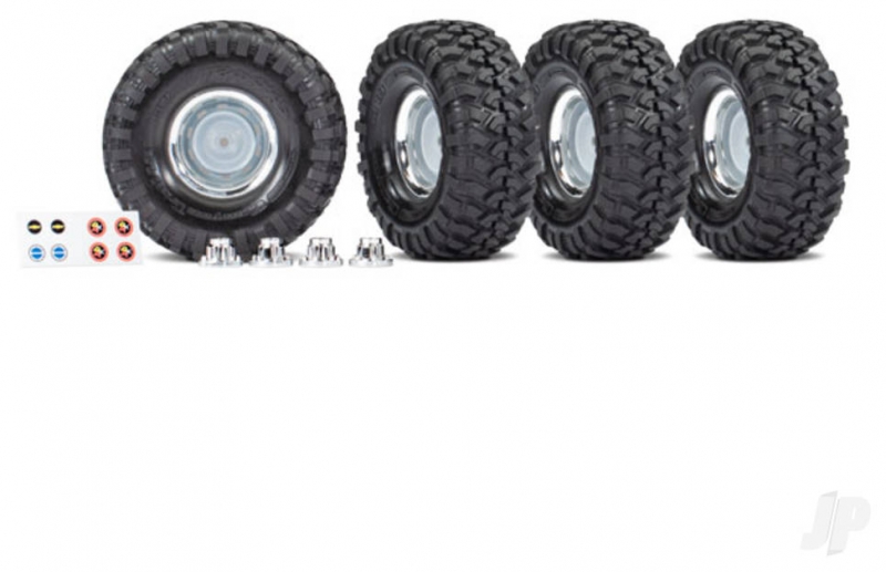 Complete the look of your classic 1972 Blazer body with this highly detailed wheel and tyre set. The all-terrain S1-compound Canyon Trail tyres come pre-glued on 1.9" rally wheels with centre caps. Although designed specifically for the 1972 Blazer body, the wheel and tyre set fits all Traxxas TRX-4 models. (Requires 8255 extended stub axle)