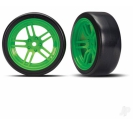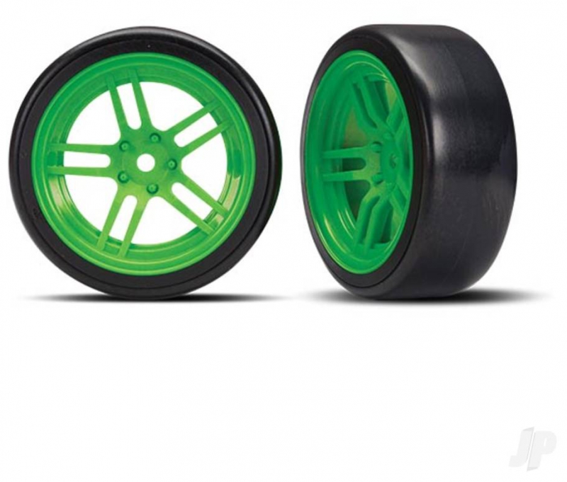 1.9" hard-compound plastic tyres provide the perfect combination of durability and breakaway potential for any drifting surface. Tough enough for carpet, concrete, and even asphalt, these tyres hold up battle after battle. Drift tyres come pre-mounted and glued on green Split-Spoke front wheels. Sold as a pair.