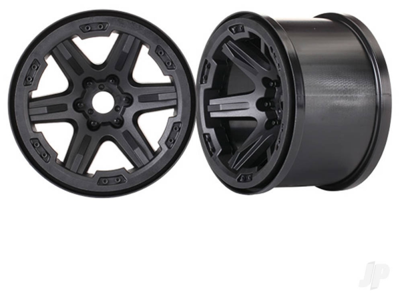 These tough 3.8" black 6-spoke wheels are built to take a pounding. Sold as a pair. Wheels require 17 mm splined hex.